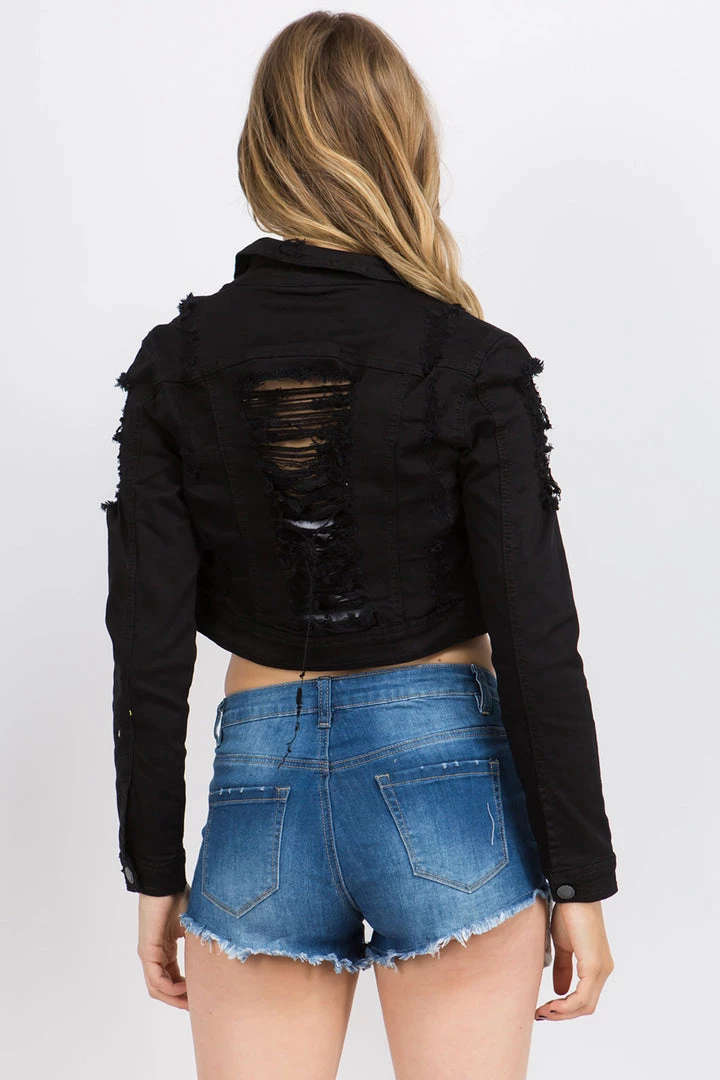 I love this jacket! The mini length is trendy, and the destroyed details give it a unique edge. However, I wish it had slightly more stretch for comfort. Overall, a great addition to my wardrobe!