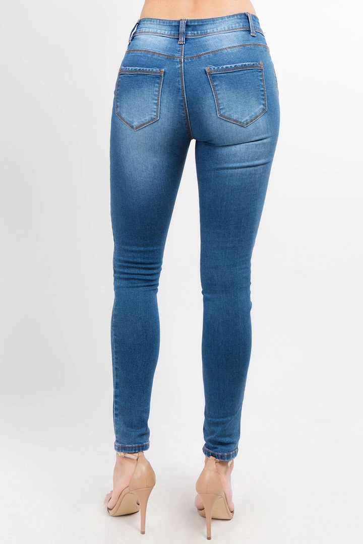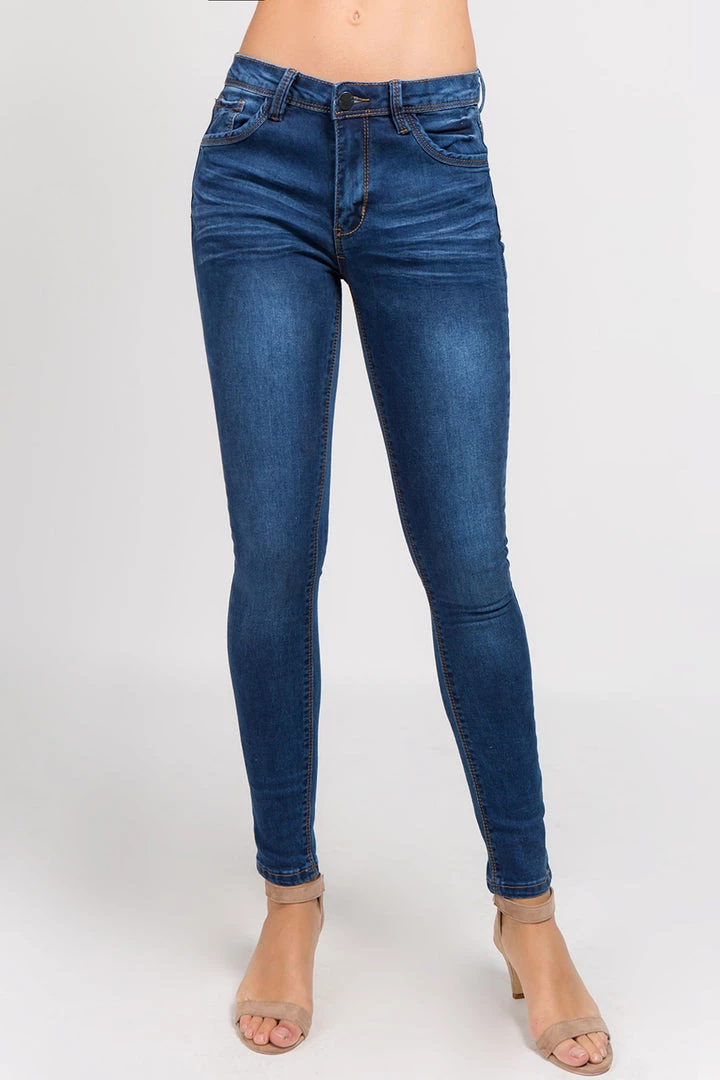 A pair of basic denim skinny jeans featuring 5 functional pockets and stretch fabric material with front zipper and button closure.