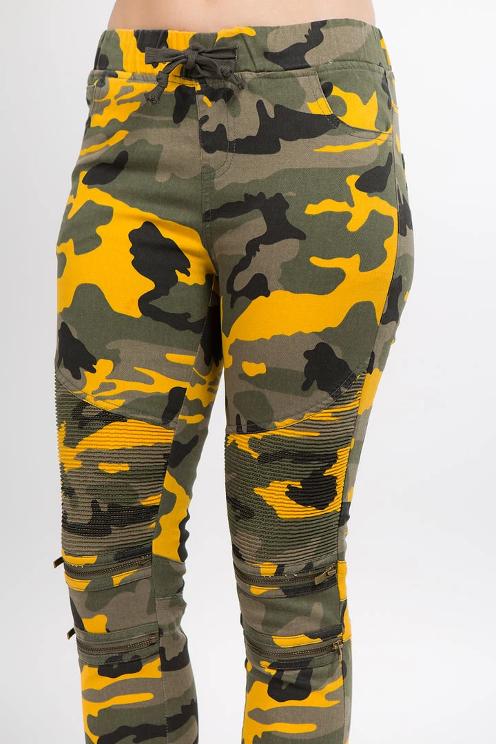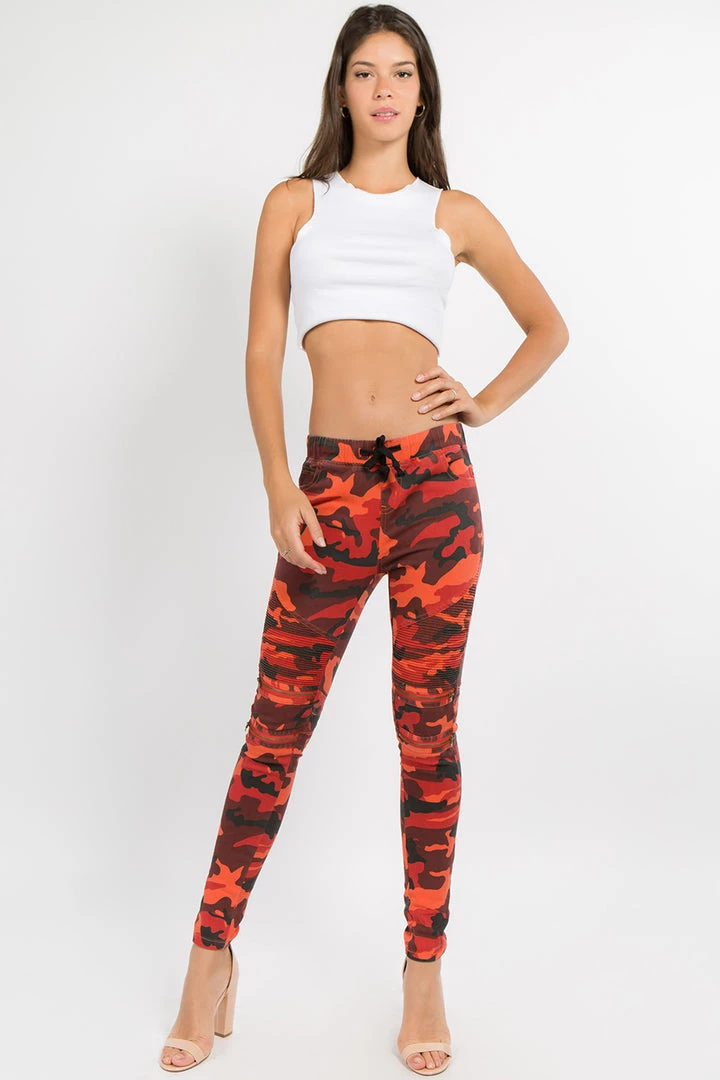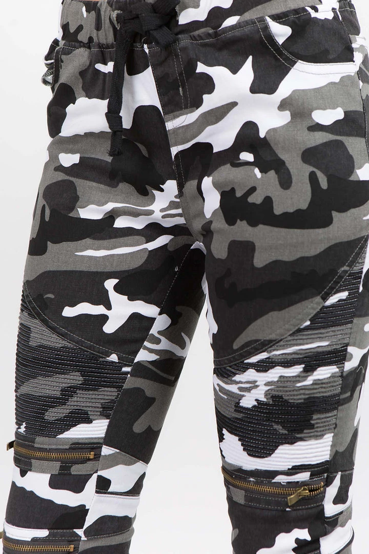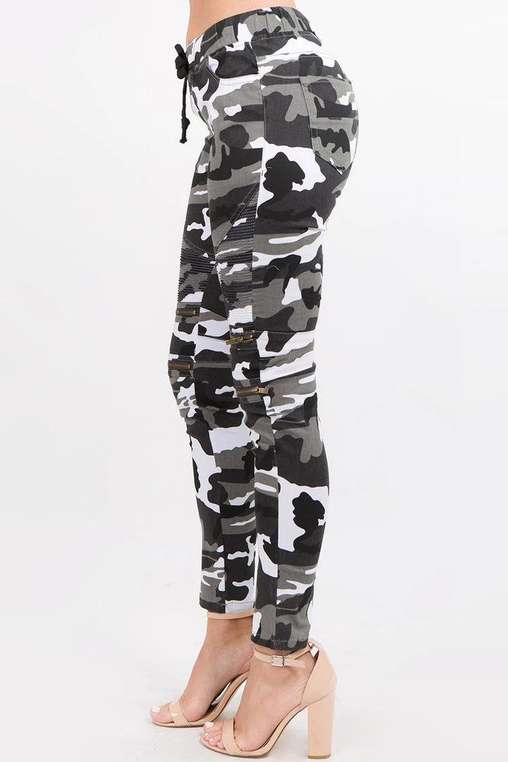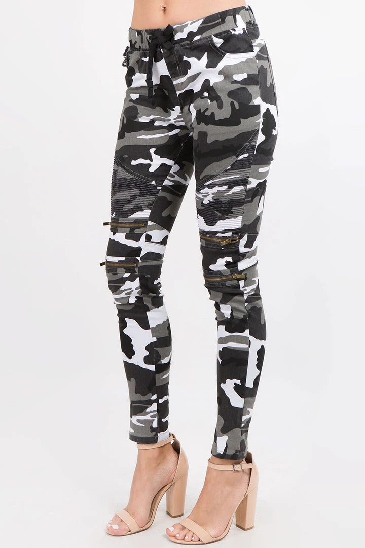 A pair of camouflage print moto joggers featuring knee zipper accents, a high rise elasticized waist and a total of 4 front and back pockets with front drawstring.