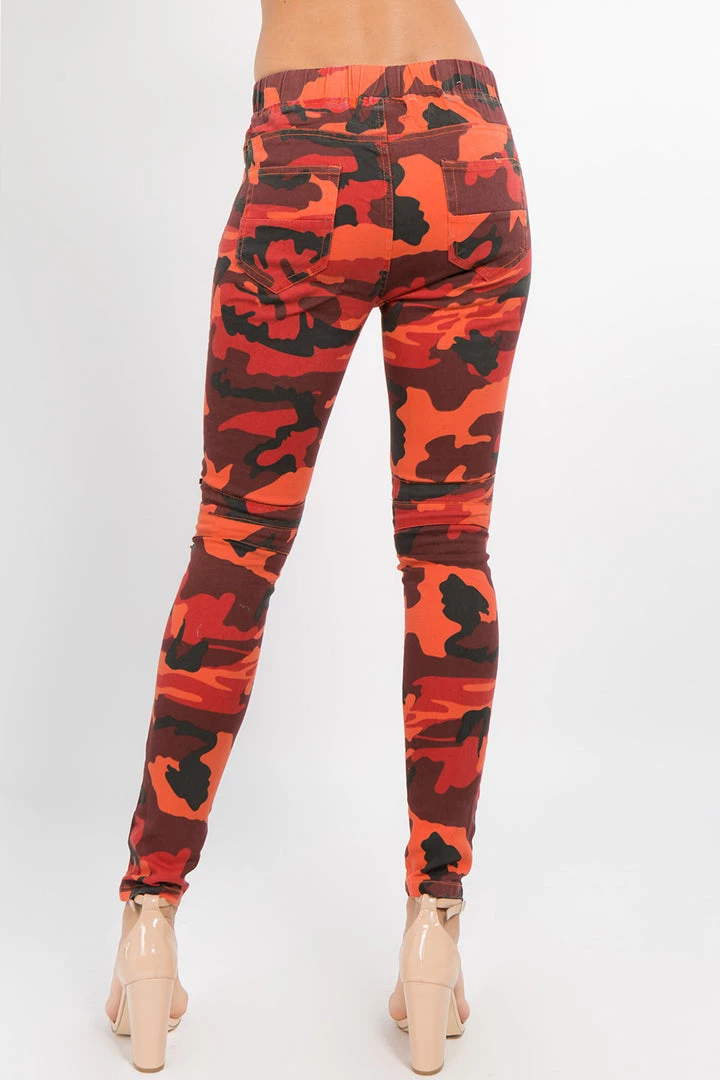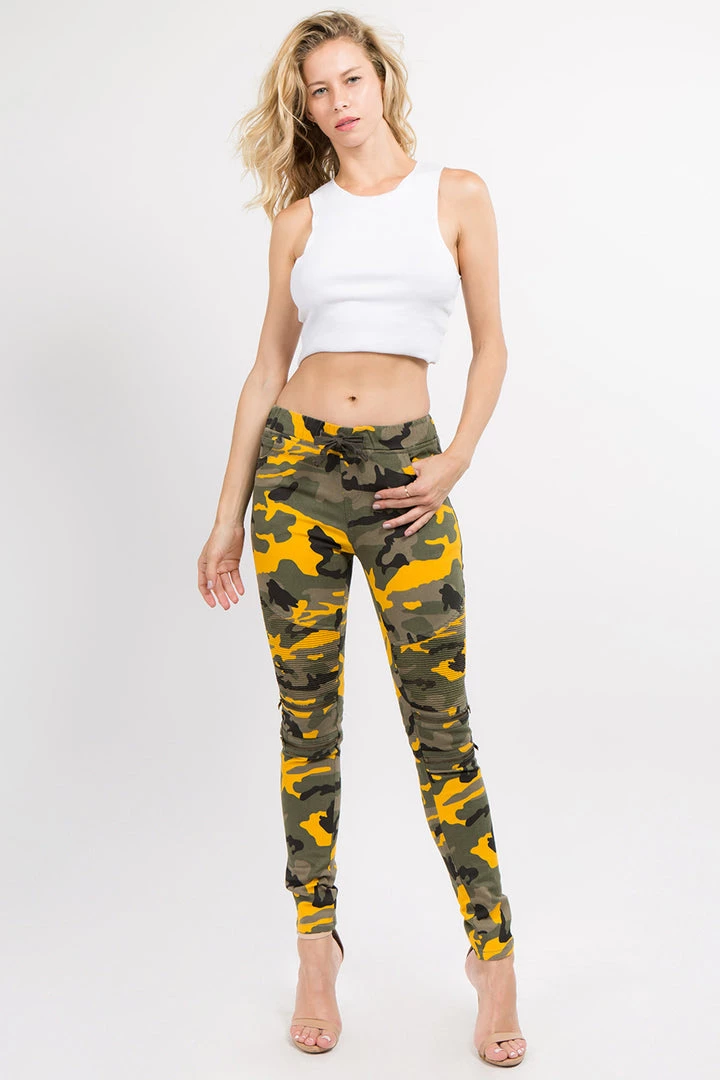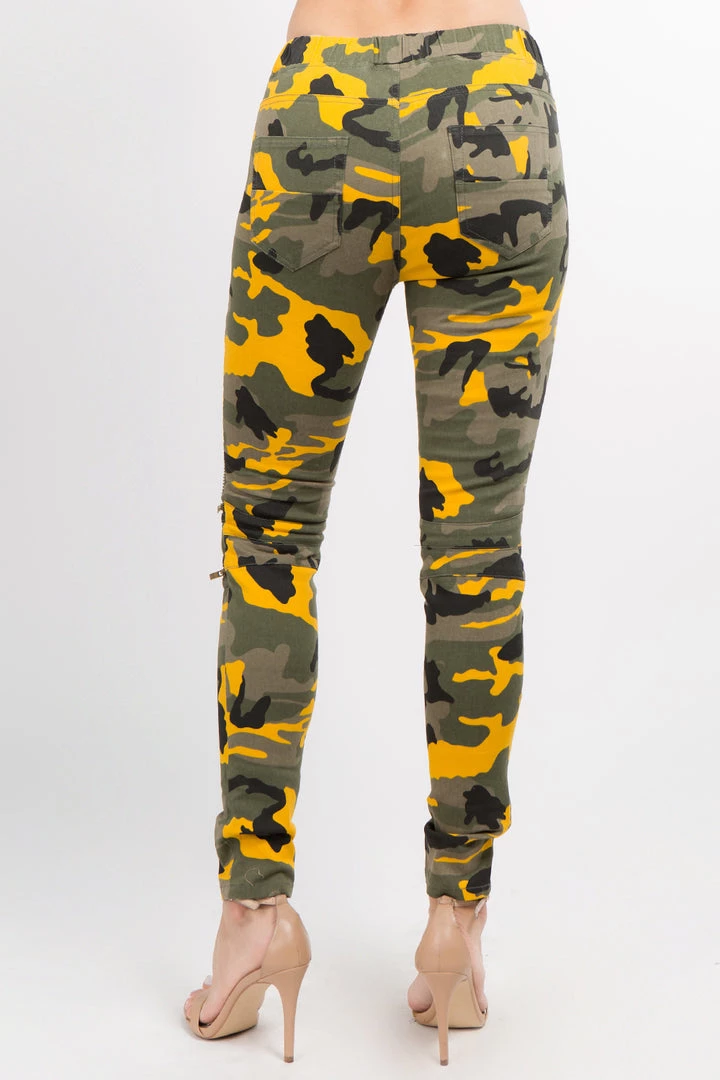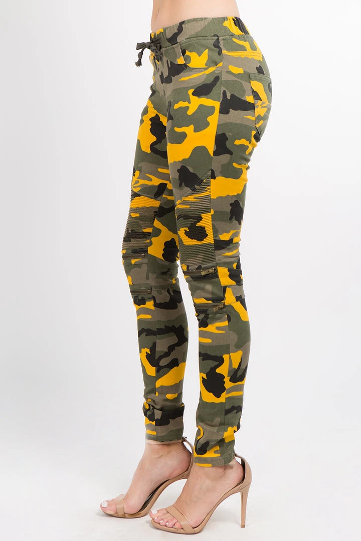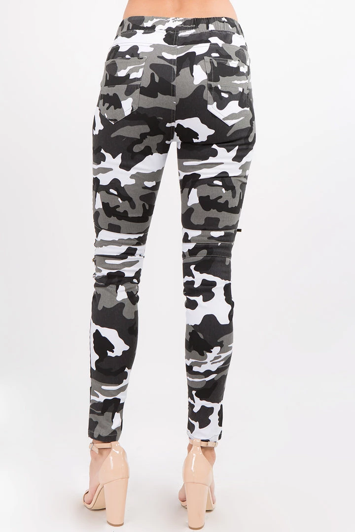 A pair of camouflage print moto joggers featuring knee zipper accents, a high rise elasticized waist and a total of 4 front and back pockets with front drawstring.