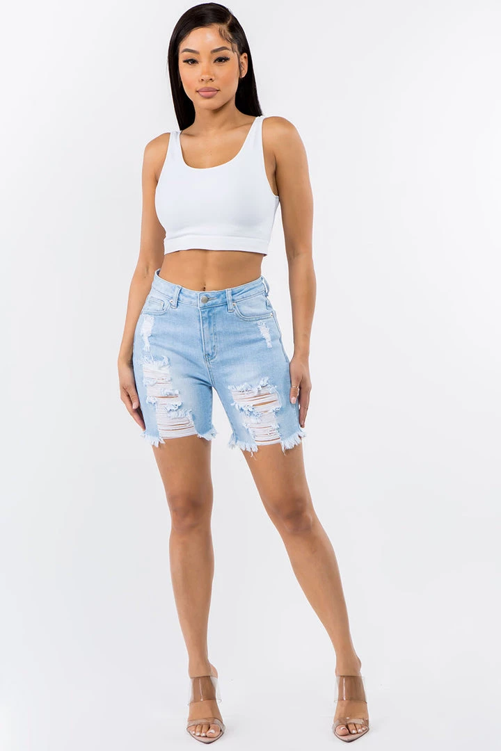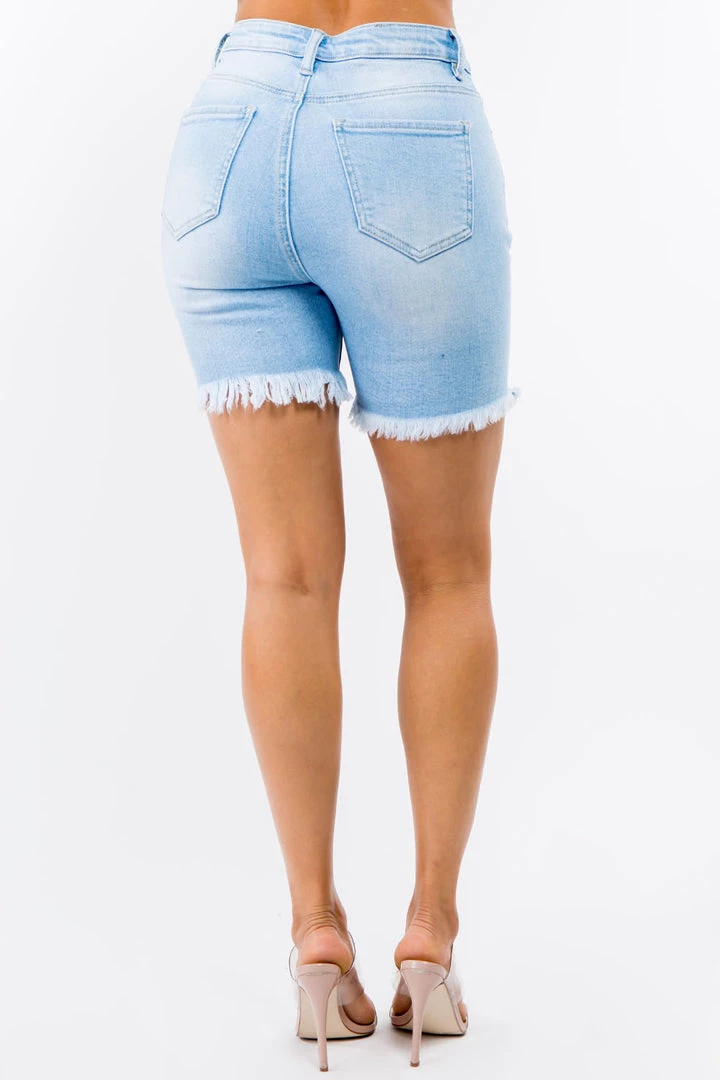 These everyday shorts are composed of slightly stretchy denim that shapes a high waist, belt loops, a classic five-pocket cut, and distressed front. Distressing and whiskering accent fitted shorts before ending at frayed hems.