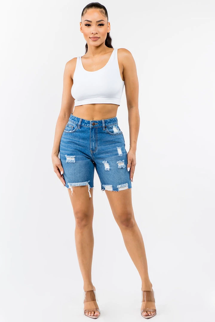 These everyday shorts are composed of denim that shapes a high waist, belt loops, a classic five-pocket cut, and distressed front. Distressing and whiskering accent boyfriend fit shorts before ending at frayed hems.