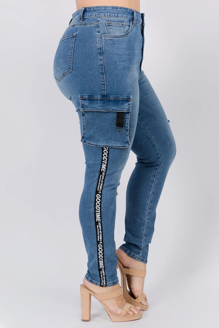 A high waist traditional skinny jean featuring cargo pockets design, good time writing on black strip on the side, and front button and zipper closure. A style that’s trendy and comfortable that makes this fashion piece perfect for an every-day style!