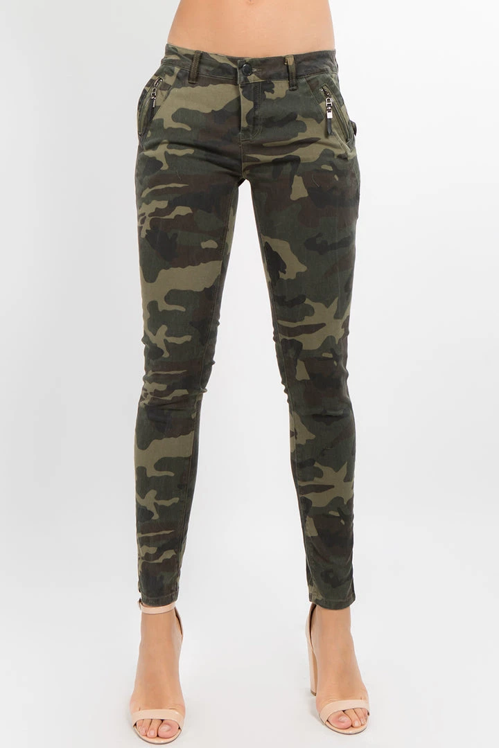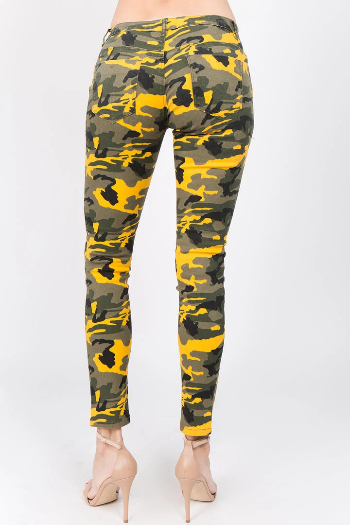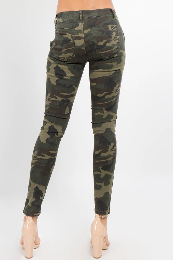 A pair of low rise camo print skinny jeans featuring 4 functional pockets, low rise waist, and front zipper and button closure.