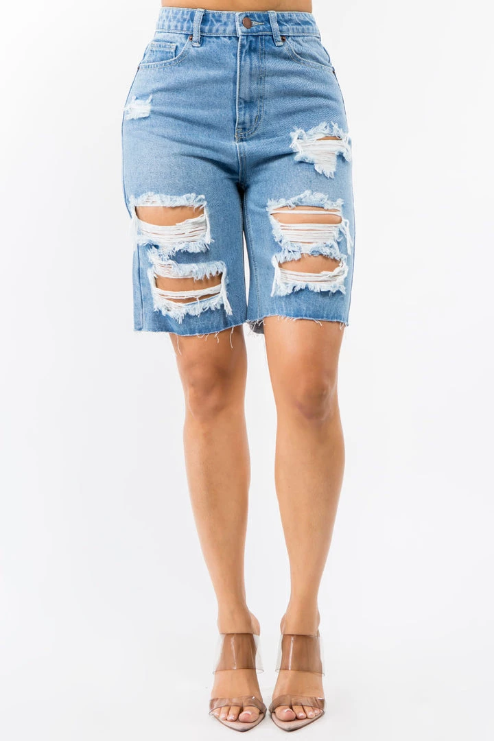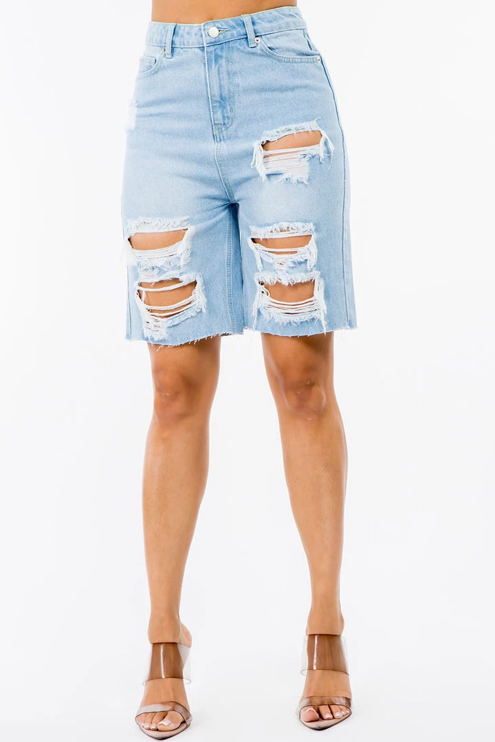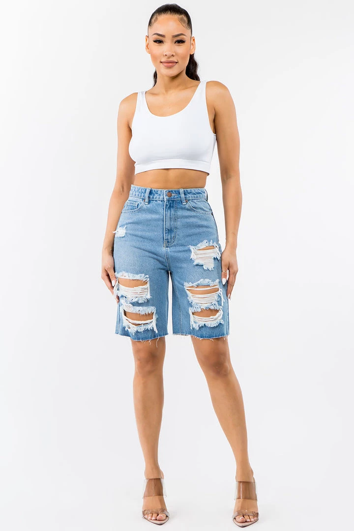 These everyday shorts are composed of denim that shapes a high waist, belt loops, a classic five-pocket cut, and boyfriend fit.Â