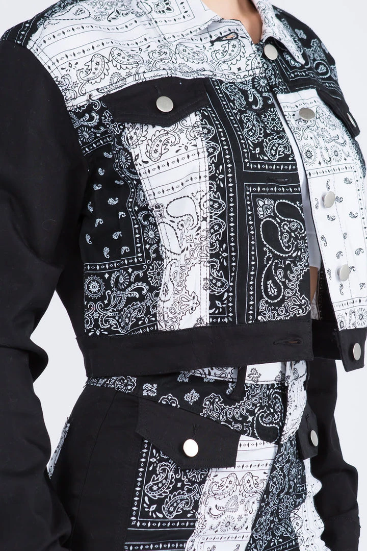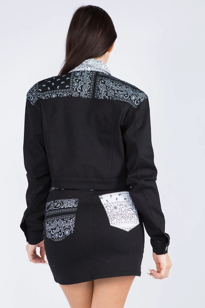 The womens Paisley Pattern Bandana Jacket Skirt Set comes as a set and is one of our favorites paired with boots. The high rise mini skirt hits above the knee and has a front button closure; the matching jacket has the similar bandana design. We love this set dressed up or down – and even wearing the pieces separately.Â