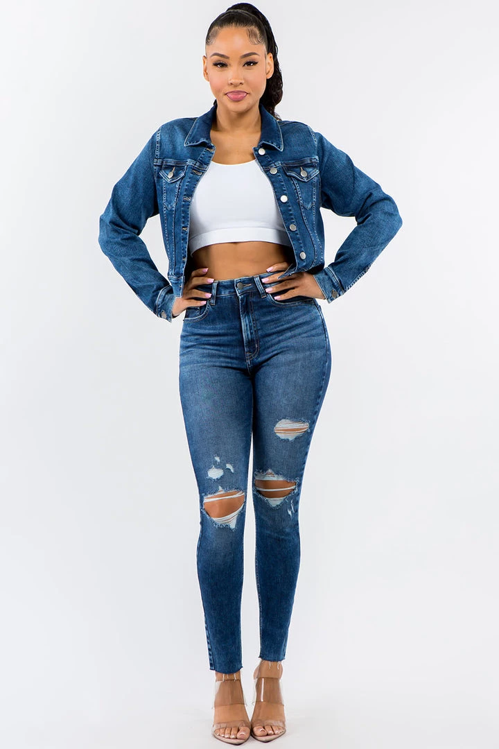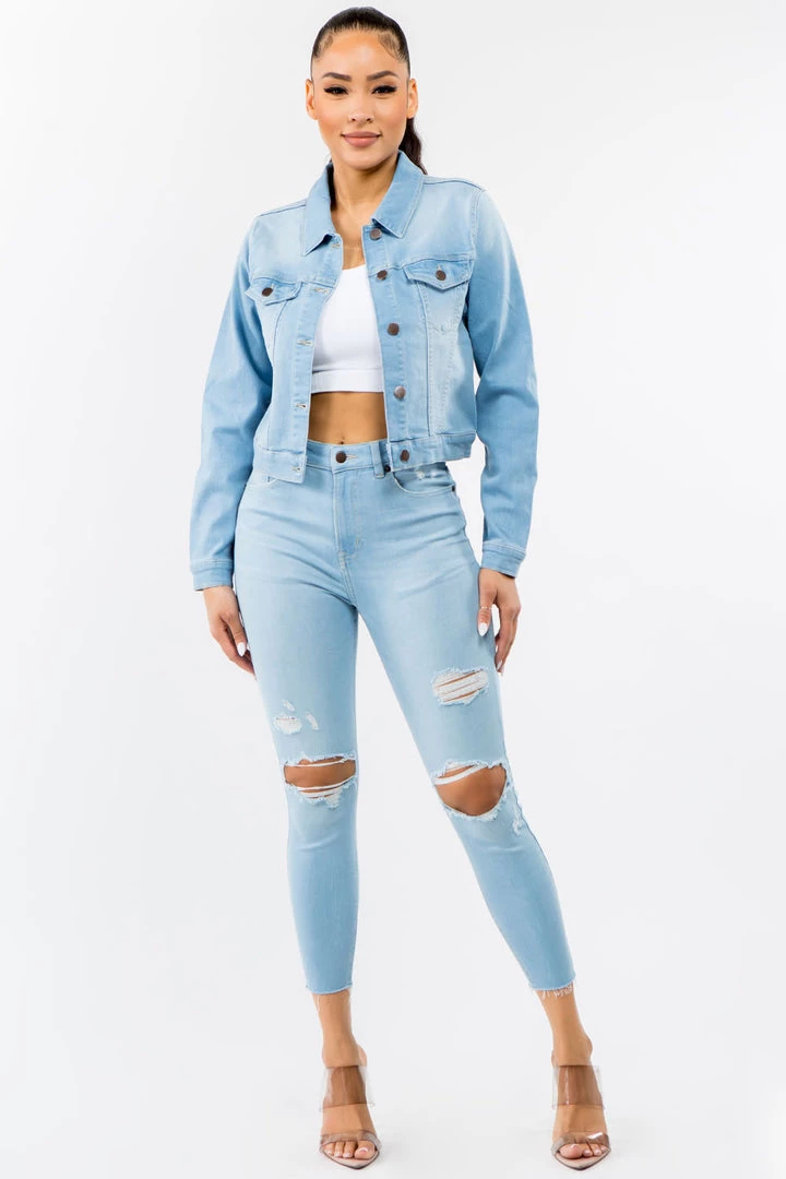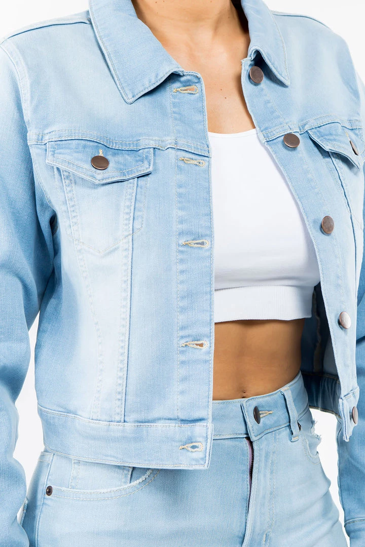 The Classic Slim Fit Denim Jacket will be the talk of the town with its trendsetting style! Lightweight denim shapes this jean jacket with a collared neckline, buttoning pockets and cuffs, front pockets, and a full button placket.