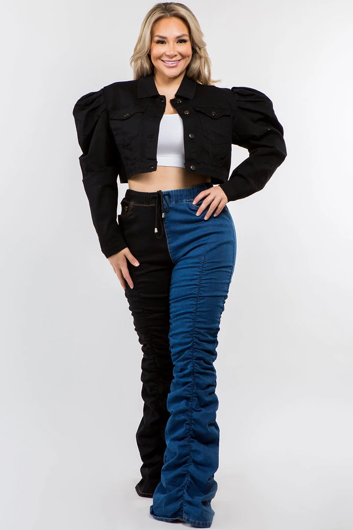 This jacket is a must-have for any fashion-forward wardrobe. The puff shoulders are on-trend, and the denim is top-notch. The plus-size fit is perfect, and the cropped length is very flattering. I get compliments every time I wear it!