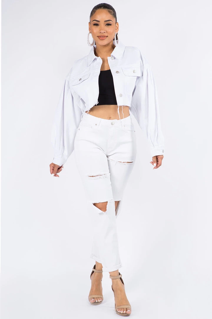 Made of 100 percent cotton denim, this boxy-cropped jean jacket has high-volume sleeves with a sculptural balloon shape. A versatile topper that’s a little different from anything else you have in your closet.