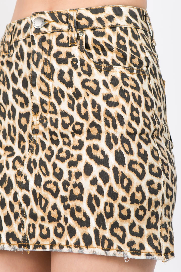 A pair of leopard print skirt featuring frayed hem bottom, functional front and back pockets, and zipper fly closure.